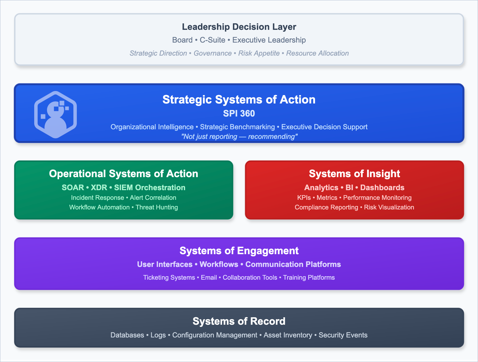 Each layer below SPI 360 serves distinct operational functions—from data collection and user engagement to automated response and analytical insights. But only SPI 360 bridges the gap between executive strategy and organizational disciplines, translating leadership vision into measurable outcomes across all system layers.